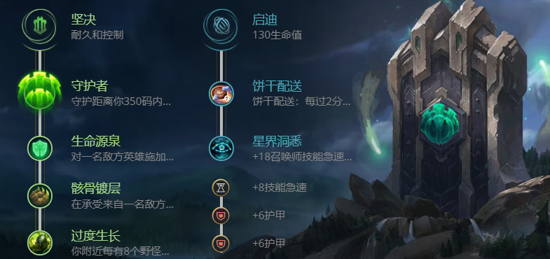 副系选择【星界洞悉】并点出技能急速,是由于锤石的技能冷却时间较长,十分依赖减CD装备来频繁释放技能。
