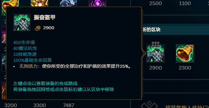 最后一件装备我们可以选【兰顿之兆】,它能增加护甲;不过要是敌方的AP伤害比较多,我们就可以把它换成绿甲【振奋铠甲】。