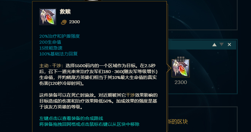 接下来要出的还是我们的辅助装备,我们决定选【救赎】。毕竟锤石本身没有加血技能,而且他的E和R技能都是范围伤害效果,在团战里能发挥不小的作用,搭配救赎的群体治疗效果,能给团队带来不错的团战增益。