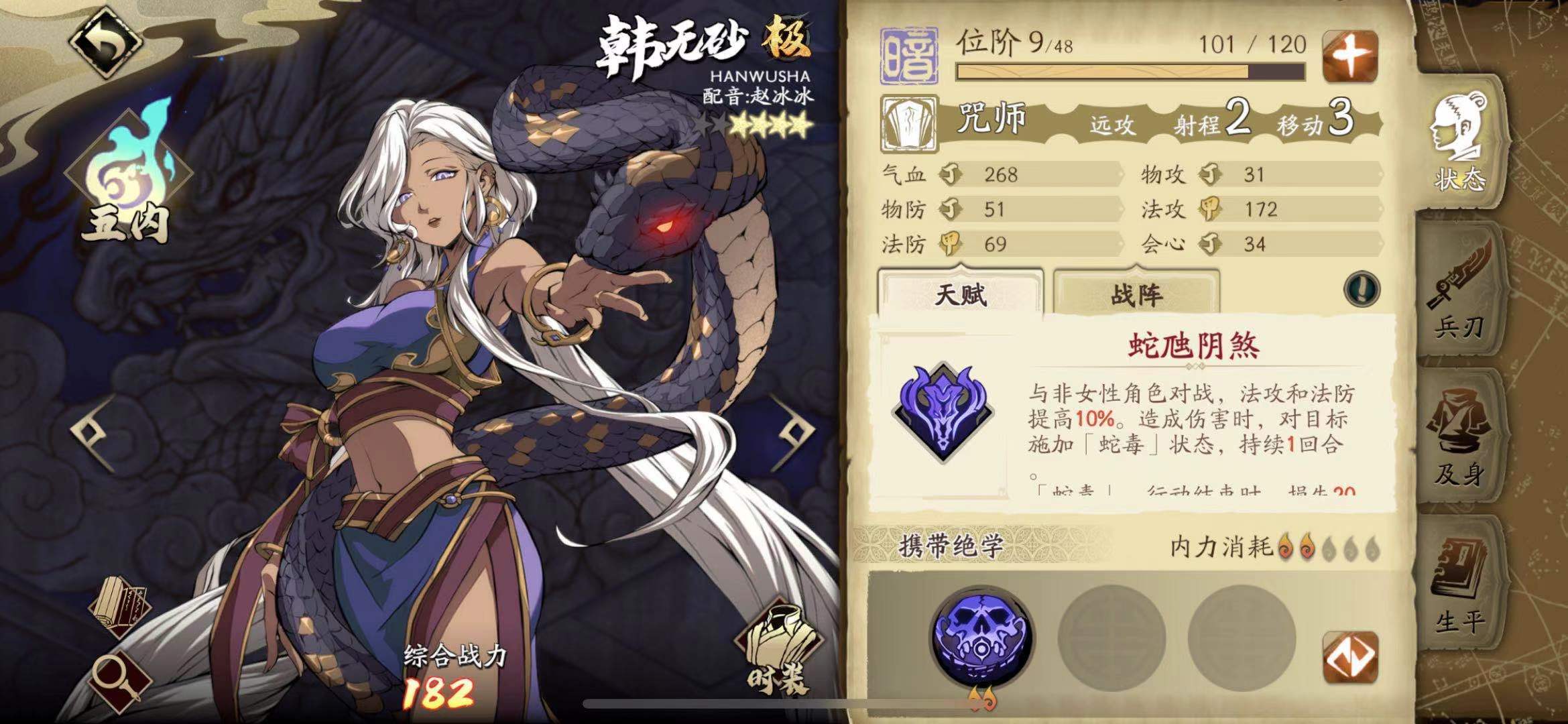 韩无砂定位为暗属性法系坦克,由于其属性和定位的特殊性,在对战中相对不容易被针对。她所具备的大范围弱化技能,在PVP玩法里能发挥出极强的效果。此外,她的万能毒王阵法可与解臾、周崇形成良好配合,后续推出的黎幽也会是与她适配度很高的角色。