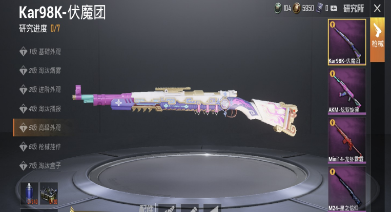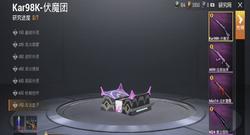 全部枪皮的外观都相当酷炫,搭配上动态和静态的特殊效果,让人看一眼就难以忘记。虽然七级的最终宝盒外观酷似“骨灰盒”,不过勉强也能说得过去。但除此之外就没有其他亮点了,关键是98K的出场概率比较低,就和M24一样,很大程度上都被玩家放进仓库里“压箱底”了。
