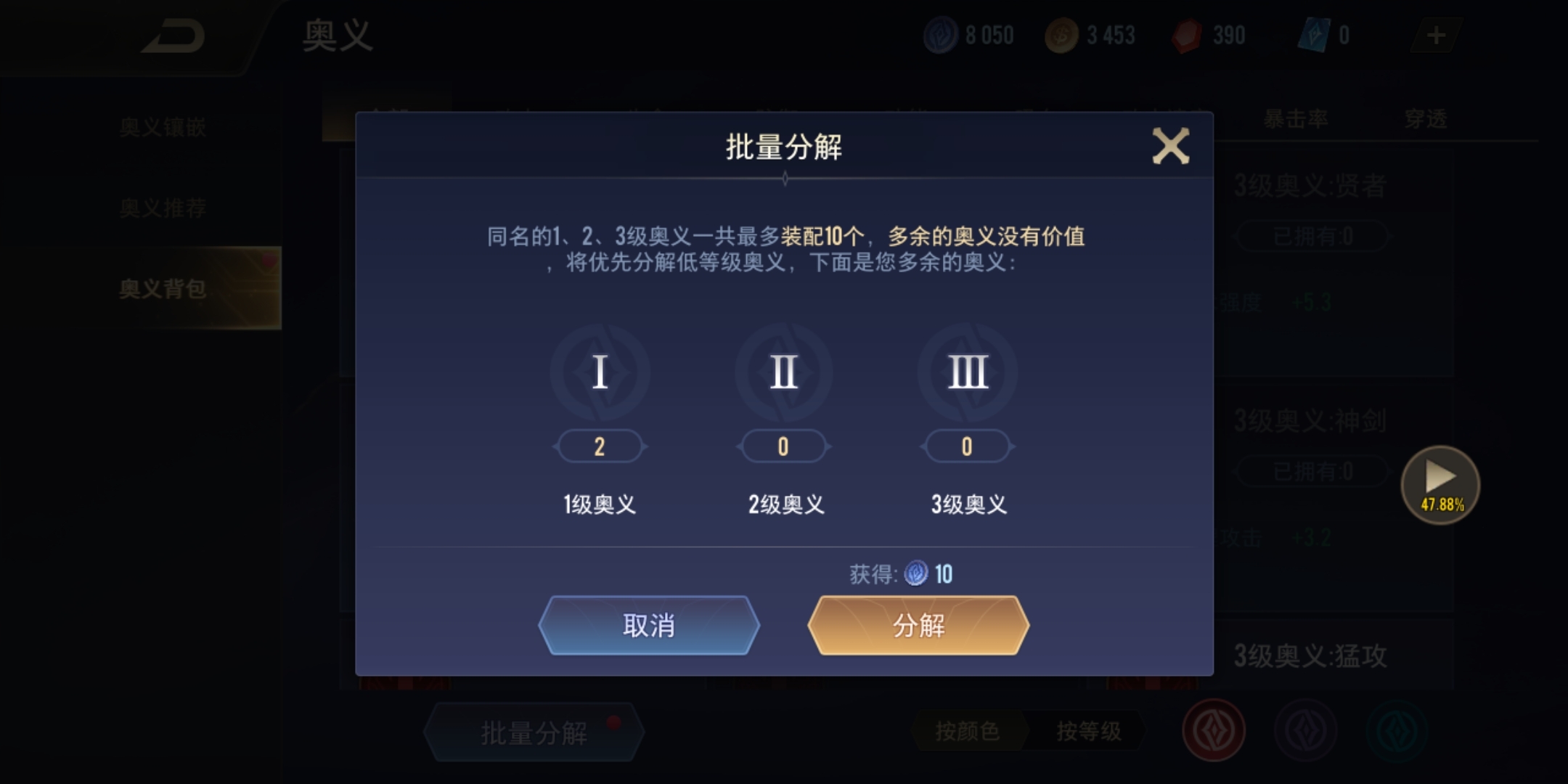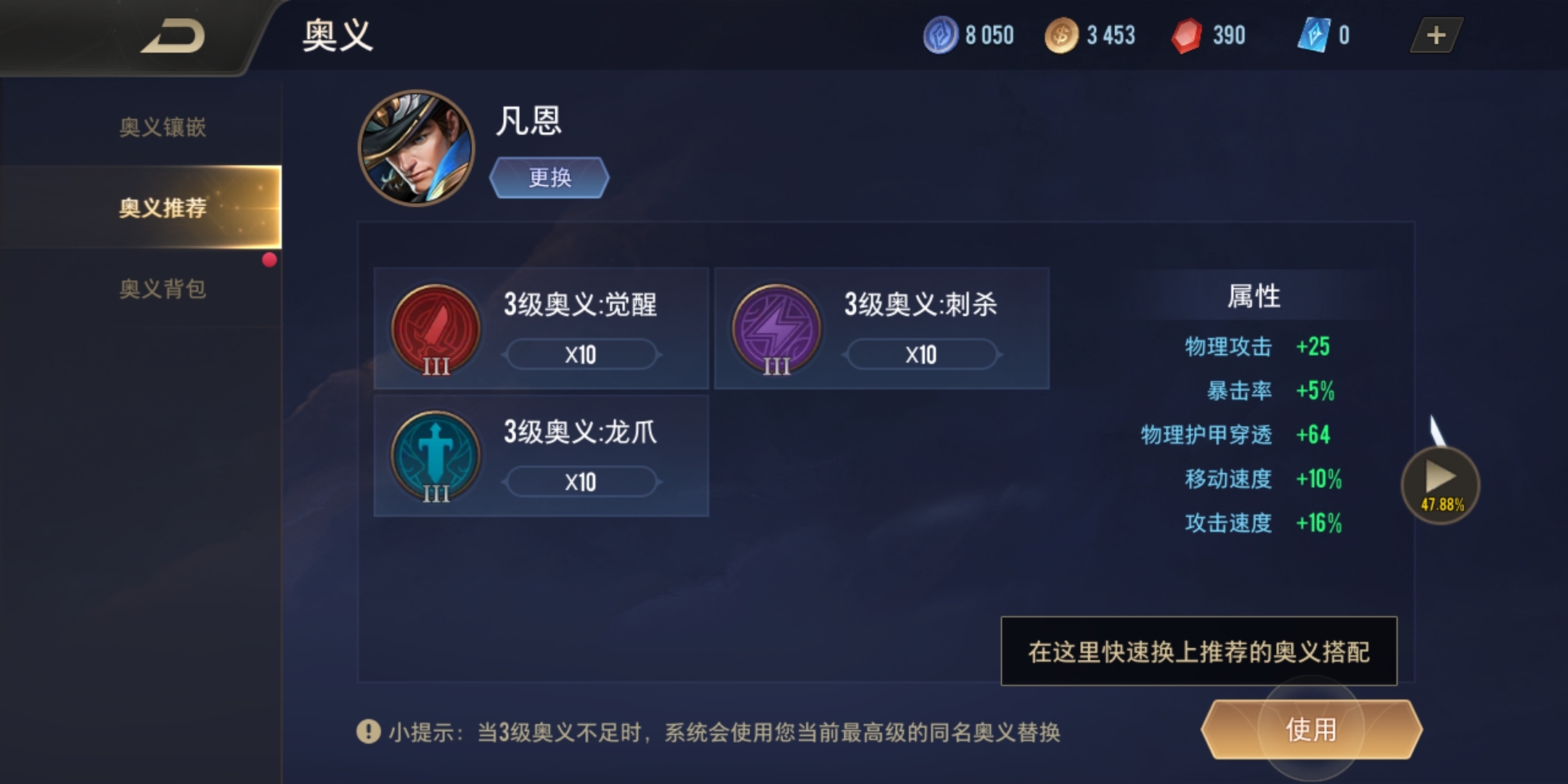 符文按照加成属性的数量划分为1级、2级与3级,每个符文页里同名符文最多只能装配10个,超出的符文无法发挥作用,所以建议优先分解低级符文来获取符文碎片。另外,玩家还能进入符文推荐界面,查看所有英雄对应的符文搭配方案,这样在之后进行符文升级和购买时就能更有规划。