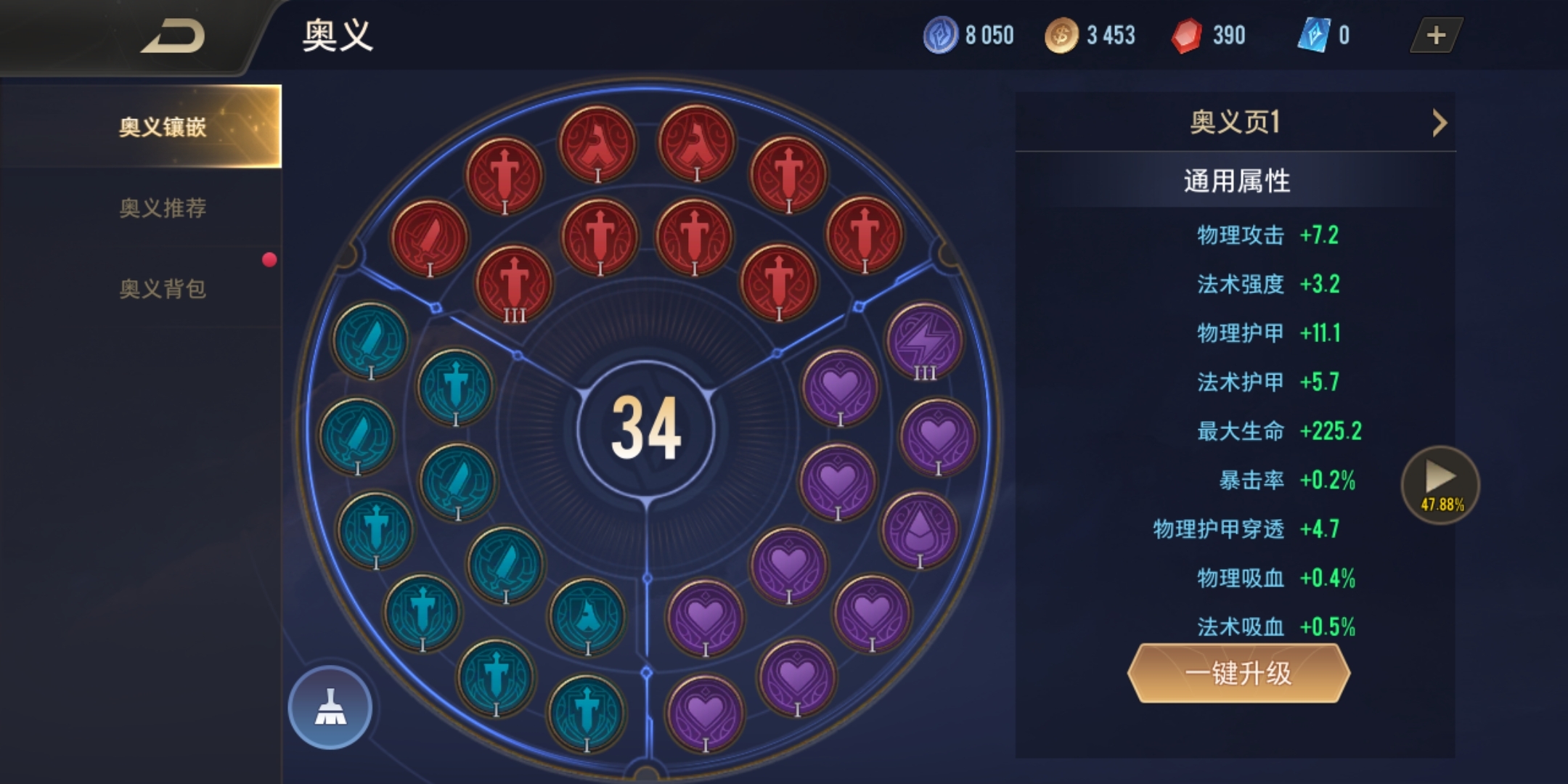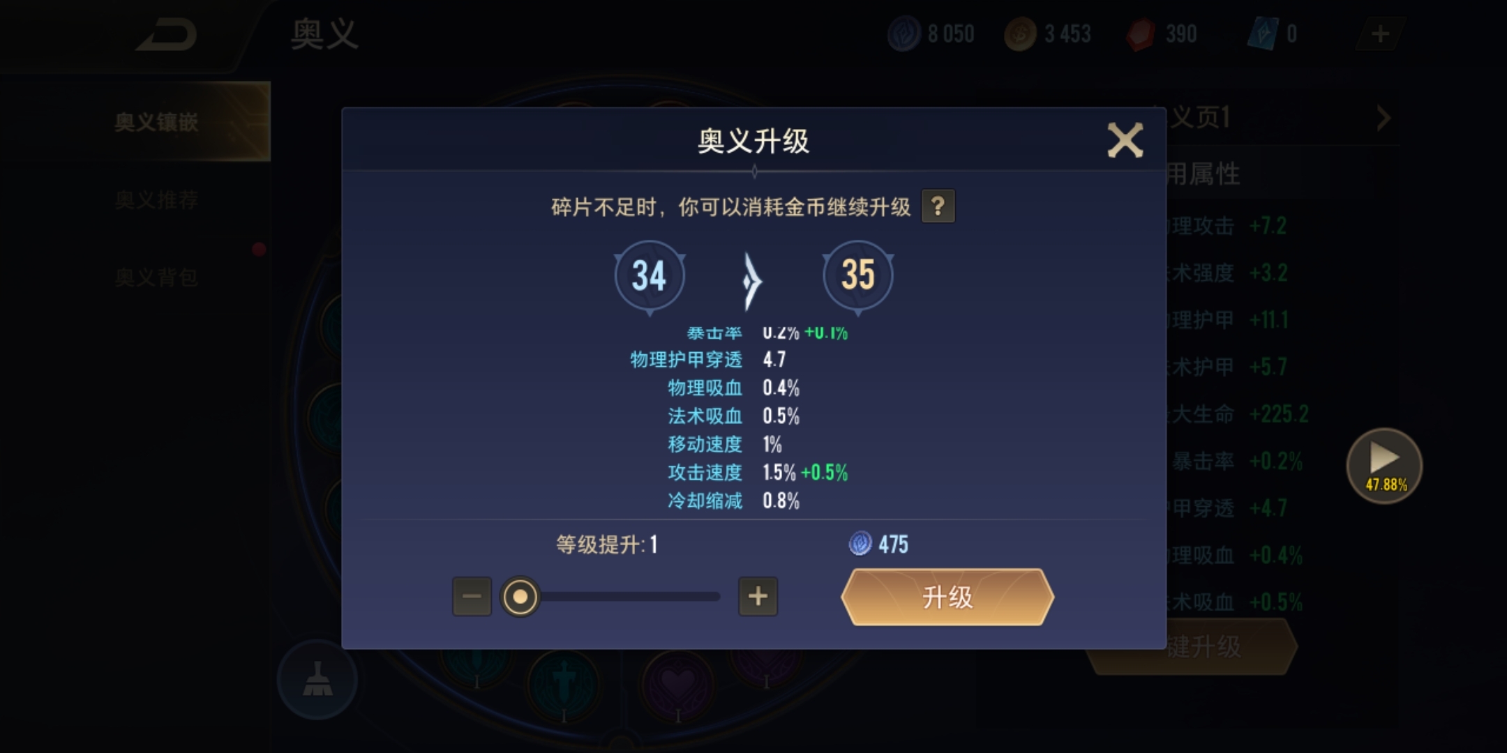 符文能够通过升级提升加成属性,完成配置后点击右下角的升级按钮,系统会优先对低级符文进行升级。升级符文需消耗符文碎片,若符文碎片不够,可用金币来替代。