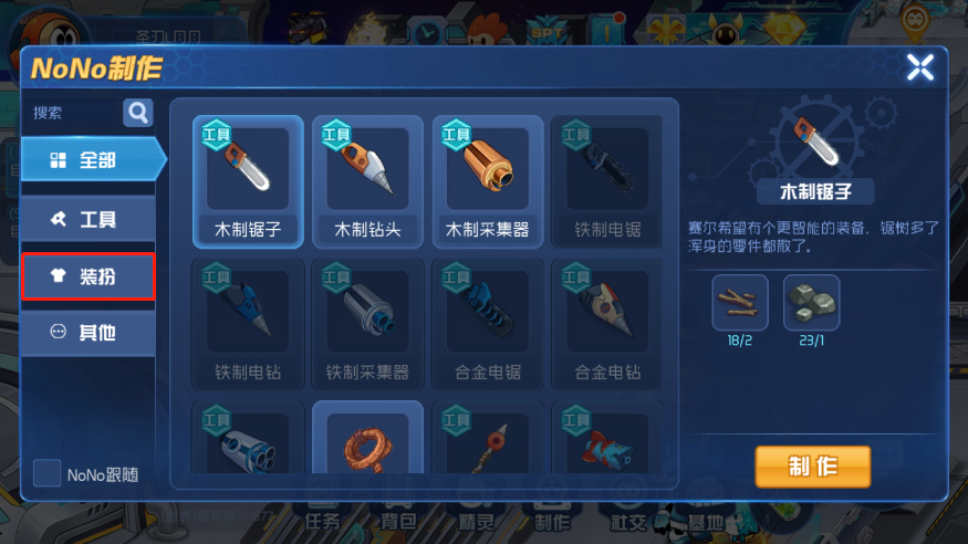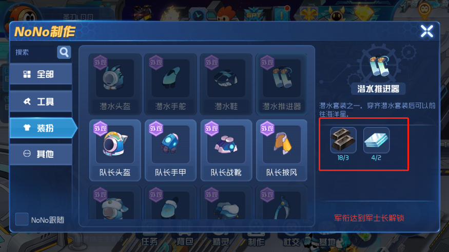 (3)制作步骤:首先进入游戏主界面,点击底部的“制作”按钮。接着点击左侧的“装备”选项,在材料集齐的前提下,点击潜水推进器就能完成制作。