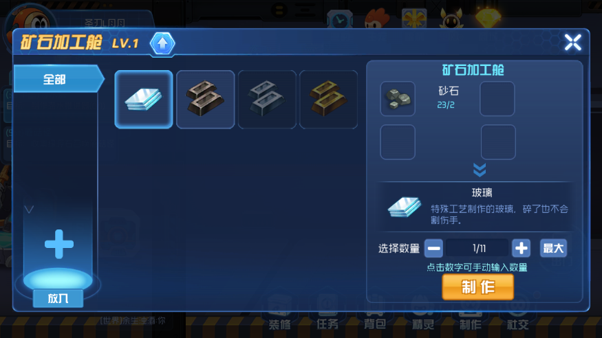 (2)玻璃:基地加工:玩家可以在“基地”使用矿石加工舱制作铁锭,两个砂石制作一个玻璃,制作过程需要几分钟的时间。砂石只能通过“克洛斯里”采矿获取。