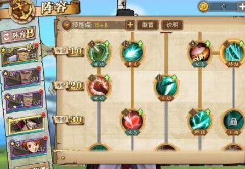 首先进入游戏的阵容界面,找到最下方的技能选项并点击进入,这时就能看到所有技能了。后期技能需要解锁全部前期技能才能使用,因此玩家必须提升对应人物的等级。被动技能和状态技能是所有角色的必备技能,技能树的最底端就是每个角色的最终奥义,尽管奥义技能有两个,但玩家需要将它们全部升级。