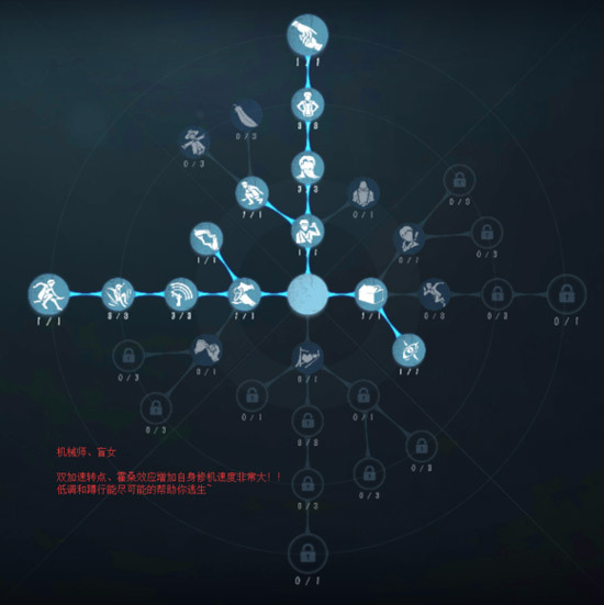 刚开始的时候,我们纯粹是为了活命,只能先把左边的天赋点出来——这个天赋能让我们跑得更快些,而跑得快的目的很明确,就是避免被屠夫抓住。等确保自己不容易被抓之后,我们再去点上方的天赋,这个天赋方便我们隐藏自己;一旦藏好了就会变得特别强势,这样我们就能专心致志地开发电机了。天赋点的选择其实特别关键,就像屠夫通常会点开门时触发的一刀斩天赋一样,我们求生者加点的核心原则,就是结合角色自身的特点来做选择。