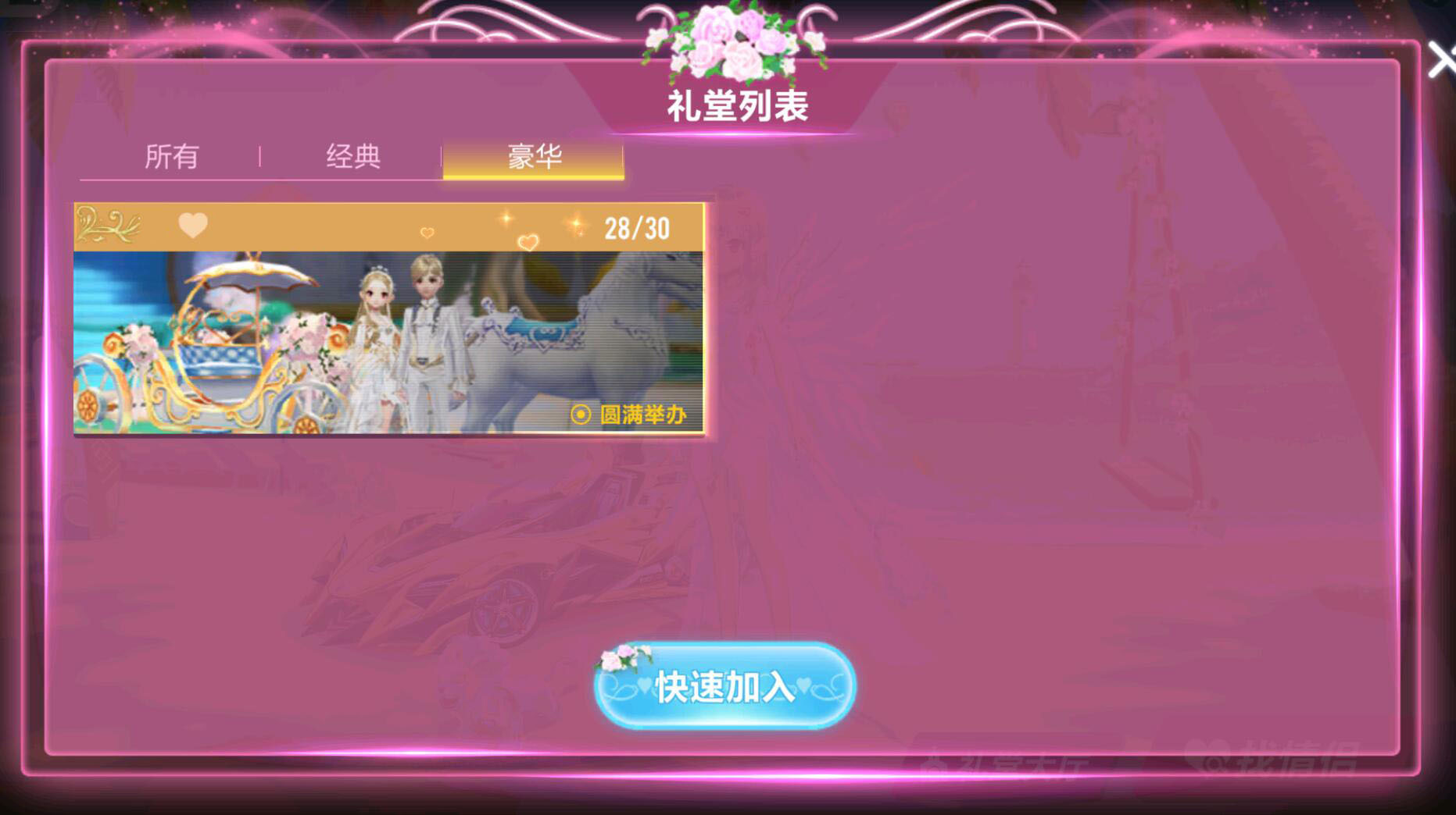 礼堂大厅是用来观摩其他玩家举办婚礼的地方,若想自己结婚,就需要点击“找情侣”这个选项。