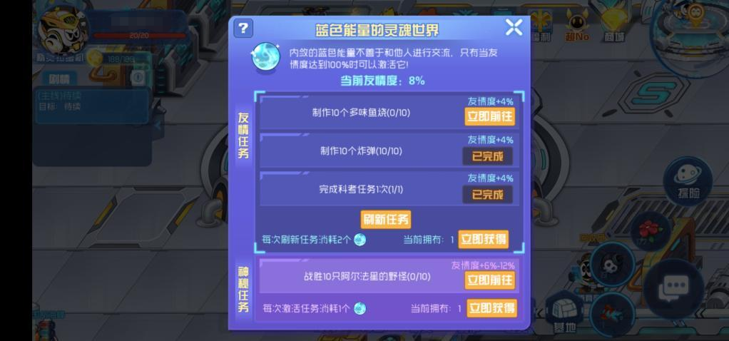 这个蓝色能量不仅获取难度偏高,还相当耗费时间精力。玩家每天完成友情任务能提升4%的友情值,不过该任务不支持自动重置,得消耗蓝色能量才能手动刷新。