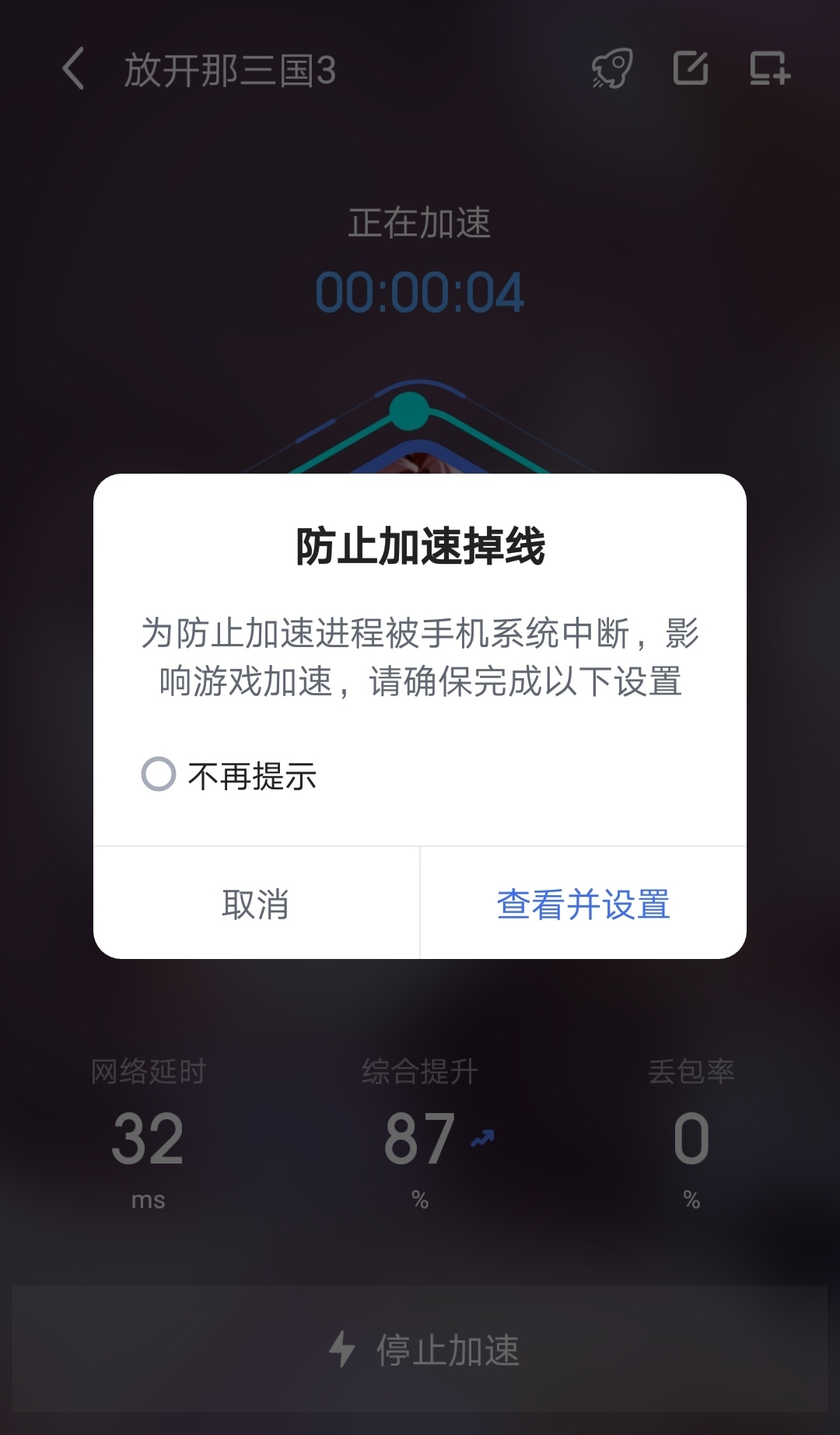 使用加速器时会弹出一个显示防掉线设置的窗口,建议玩家务必配置好该防掉线设置,以便确保加速器运行得更稳定。