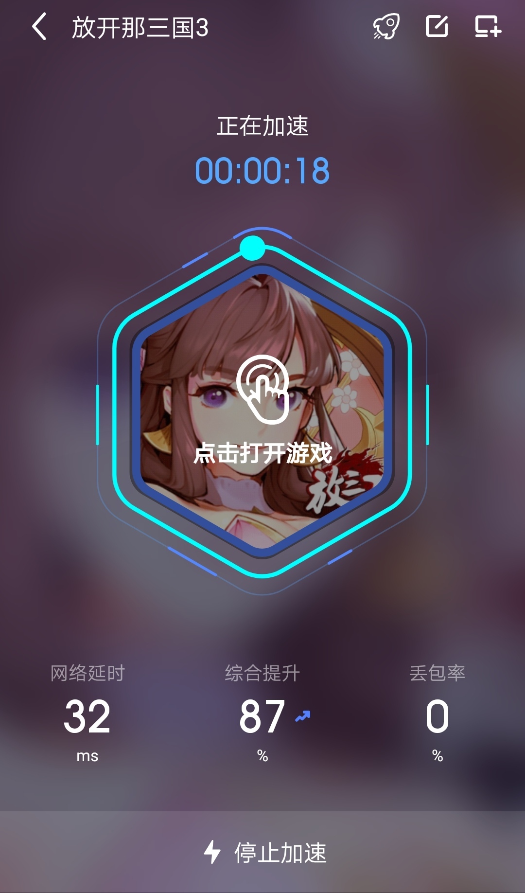 下载完成后,游戏会安装到手机桌面。接下来需要打开biubiu加速器,搜索该游戏并点击加速按钮,此时biubiu加速器会直接启动游戏,玩家无需再从手机桌面手动打开。加速完成后会显示如下图所示的画面,其中丢包率为零属于正常状态。需要特别注意的是,务必正确设置“网络智能切换”选项,这样当当前网络出现不稳定情况时,系统就能自动切换至其他可用网络。
