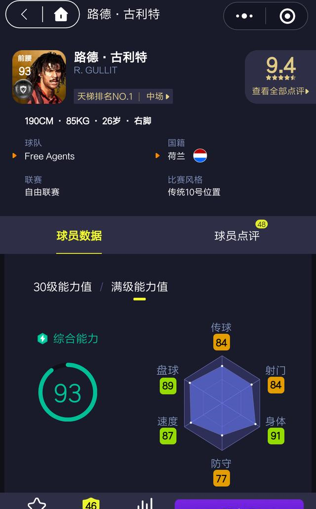 在实况足球手游里,古利特也是玩家们非常青睐的球员之一。游戏中他注册的位置是前腰,不过实际上中轴线的位置他都能胜任,踢中锋或者中卫也很出色,而古利特在天梯模式中胜率最高的位置是中场,比同样是传奇球员的马特乌斯(排名第二)高出了一个多百分点。