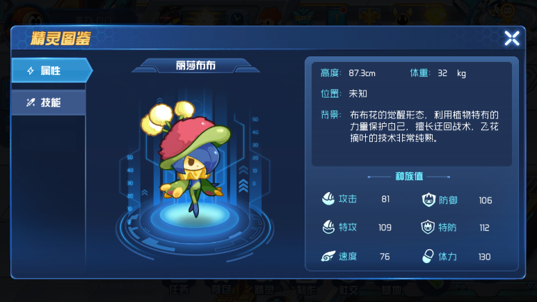 (1)丽莎布布:丽莎布布是游戏里御三家角色布布种子的觉醒形态,其进化路径为布布种子先进化成布布花,之后觉醒成为丽莎布布。
