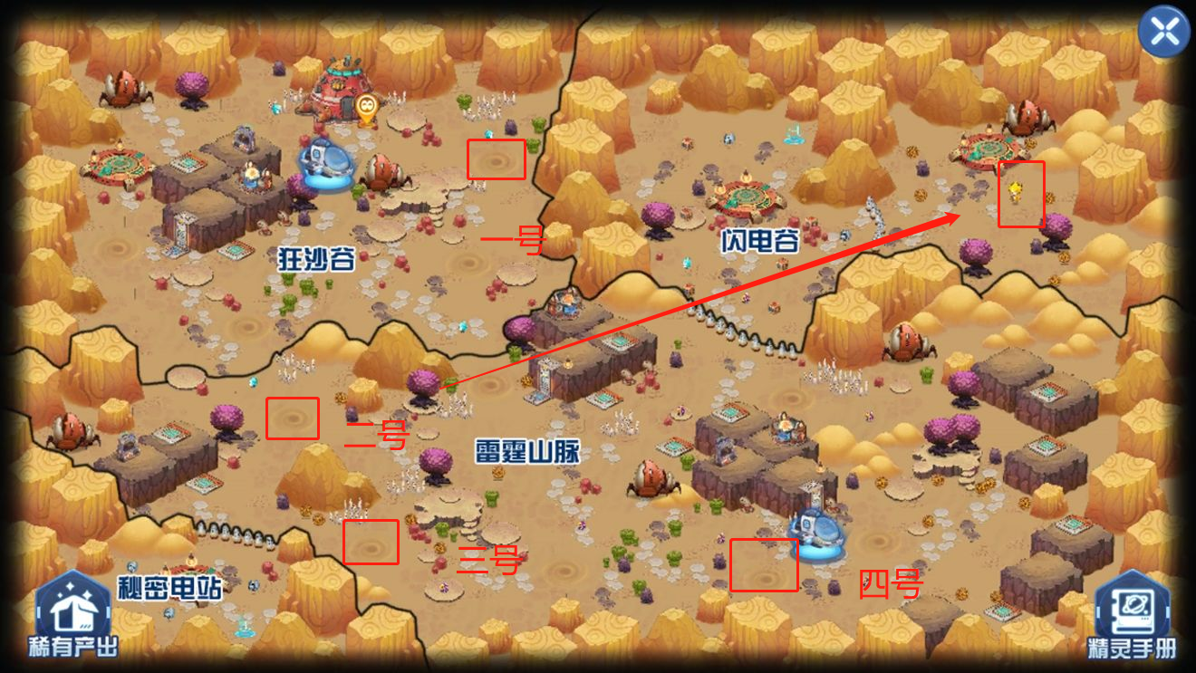 (2)方法一:玩家可借助一号流沙与二号流沙,二者通往的区域相同,并无差异。从这里能进入矿洞,玩家在此处可获取两个星能。拿到后往右侧行进,持续走下去便能抵达“闪电谷”,该地点位于地图的中上方位置。