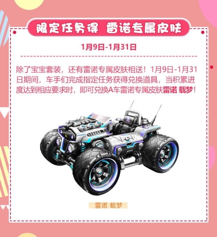 这次三周年庆典活动,除了赛车本身,还会为大家送上A车雷诺的专属皮肤。不过要获取这款皮肤,得等1月9日相关任务上线才行,任务同样在1月31日结束。赛车手们只要完成指定任务,就能得到活动专属的兑换道具,当积累的进度满足对应条件时,就可以兑换A车雷诺的周年皮肤——雷诺·载梦啦。大家觉得这款皮肤是你们喜欢的类型吗?