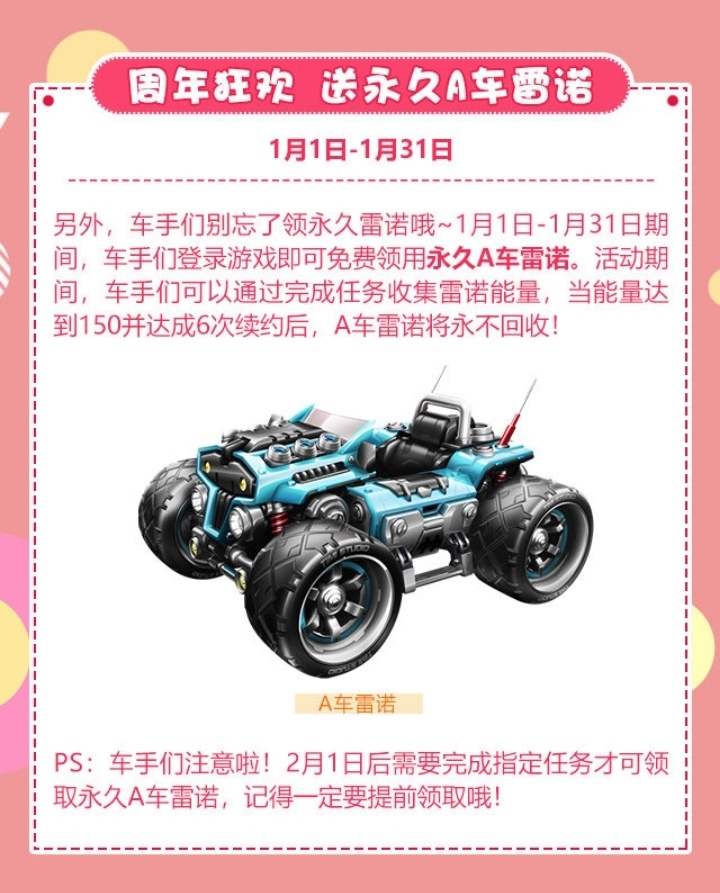 QQ飞车官方特此提醒各位车手,永久A车雷诺需在2月1日版本上线后,通过完成指定任务方可领取。