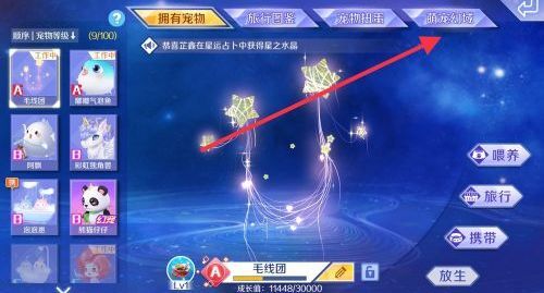 那怎么找到我们已经购买的甜梦小枕呢?首先,如果在“拥有宠物”里找不到它,就要从右侧的“萌宠幻域”进入——因为这个宠物属于高阶宠物,只能在那里找到。当大家进入到有“喂养”“旅行”“携带”“放生”这些功能的界面时,就说明已经能找到甜梦小枕啦。