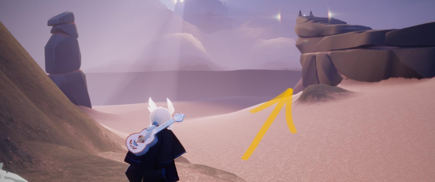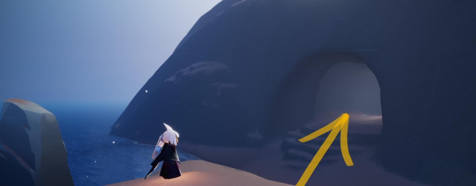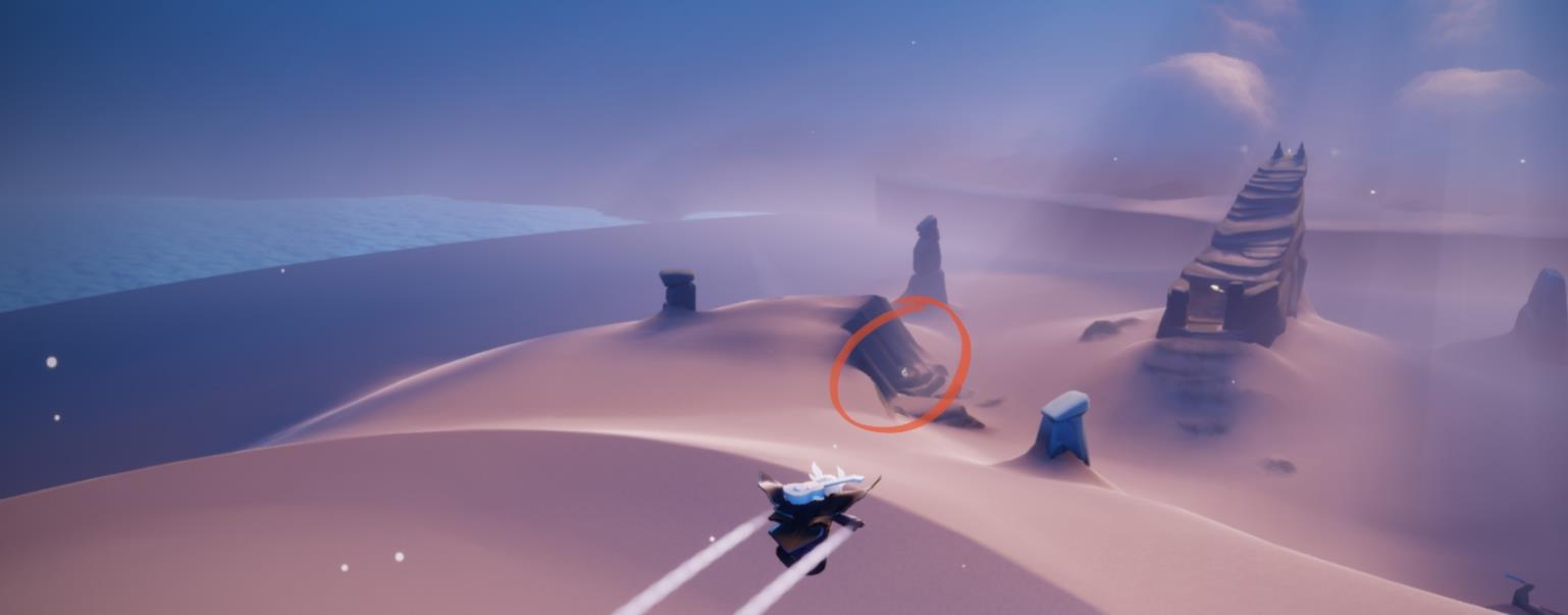 穿过山洞,踏上这片土台,往左侧前方继续走,到了下图标注的地方,就能瞧见第一个身影啦,他就在沙坡的山洞外头呢。
