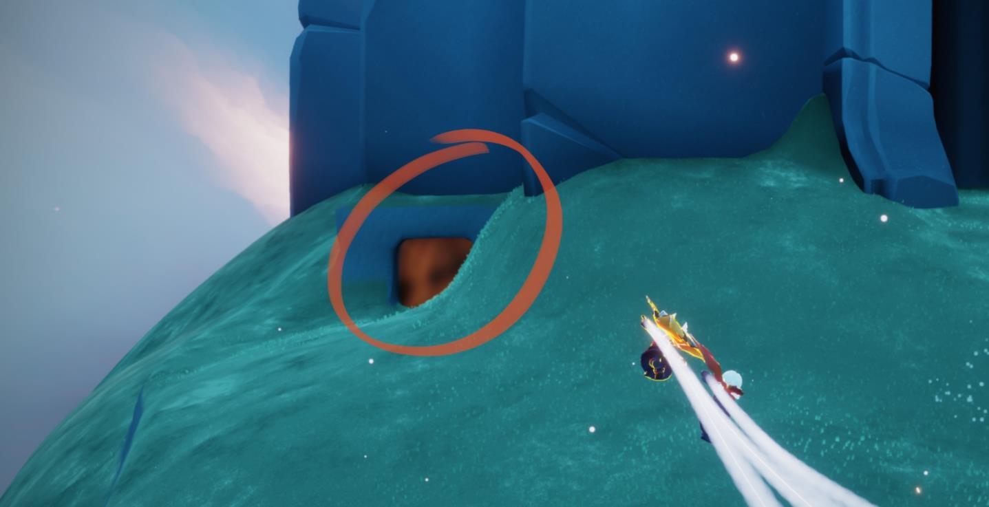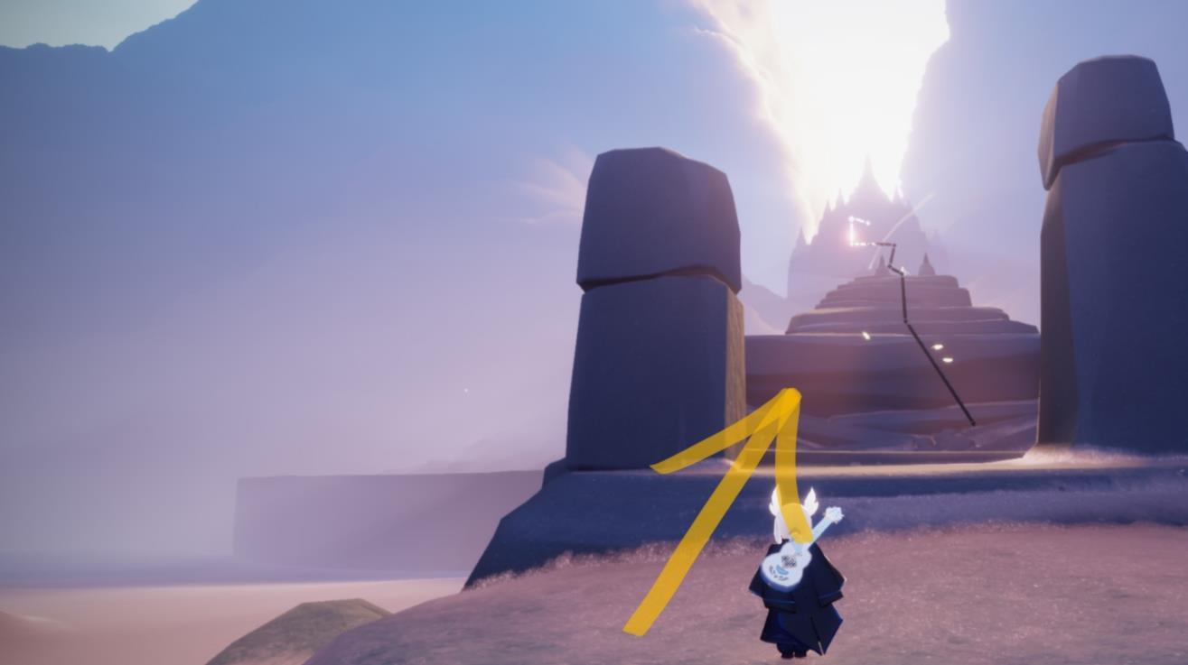 接下来是最后一个了,他就是拒绝先祖。要是想找到他,各位先来到这个台子上,进去之后朝着前方的神庙飞过去,在神庙的左侧能看到一个洞口,第三个先祖就藏在这个洞里哦。