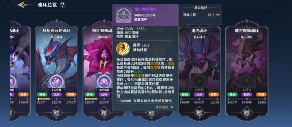 在游戏里,这个魂环是第五魂环,得靠猎魂之证才能拿到手。它有三个不同的年份,其中12000年的版本属于完美品质,带来的效果比普通年份的魂环要强上不少。从效果来看,这个魂环主要是强化角色的被动能力,属性提升方面侧重于爆发。不同魂师使用它的效果会有差异,但通常都能触发持续5秒的爆发战力提升状态,处于该状态下的魂师战力会提升至原来的1.4倍。