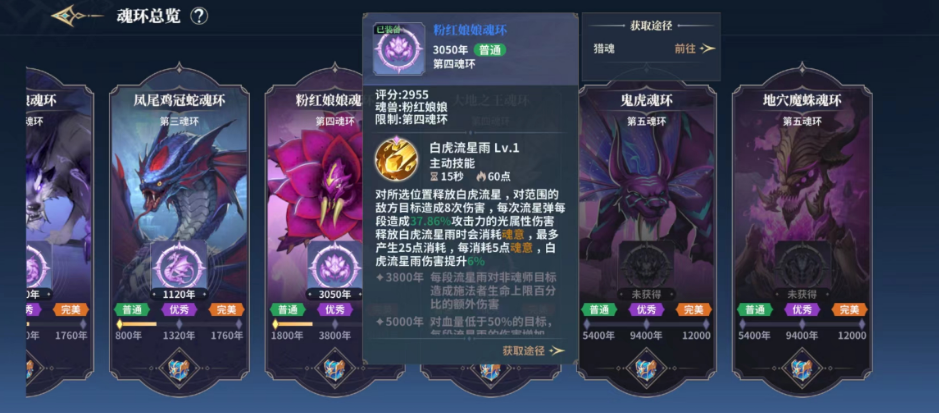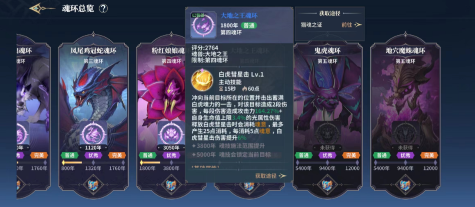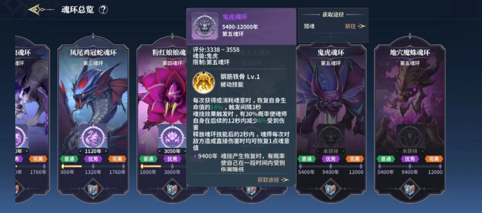 这个魂环是第四魂环,玩家等级达到四十级左右就能装备。在游戏里,它能为玩家带来一定的伤害提升,效果相当强势。当魂环年份达到完美时,可触发两段同等伤害;前期积累的魂意到了后期也能转化为可观的伤害输出。该魂环会依据玩家自身的生命上限附加属性伤害,同时消耗一定魂意,每次消耗魂意都能使伤害提升6%。