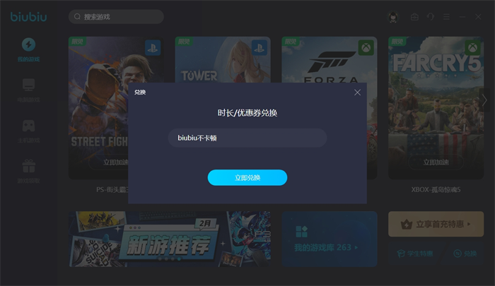 平台为新人用户准备了专属福利:新用户登录即可享受24小时加速体验;此外,在首页点击“兑换”按钮,输入兑换码【biubiu不卡顿】还能领取3天加速时长,老用户同样可以参与领取哦。
