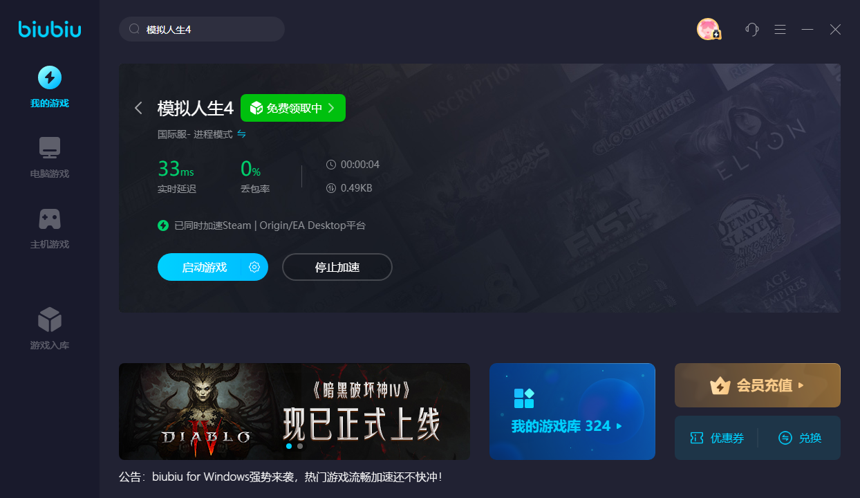 当《模拟人生4》的玩家想玩游戏时,直接打开biubiu找到这款游戏并点击启动即可,无需先后打开biubiu和游戏程序,在biubiu内就能一键完成启动与加速。从图中可以看到,biubiu对《模拟人生4》的加速效果相当不错,网络状态也显示为绿色。