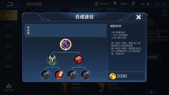暗影战斧即黑切,该装备特别周全,不只带来物理攻击、CD、最大性命,其被动又有物穿与减速特效,特别符合战士英雄,不止这样,黑切合成也比较腻滑,实惠。