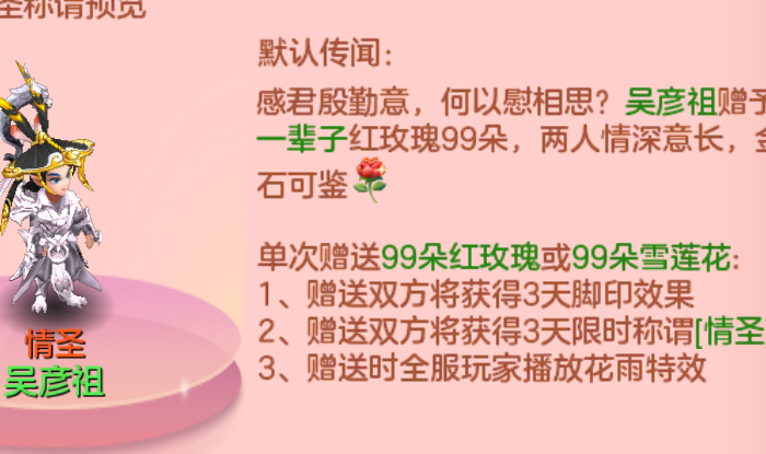 首先要达成的是“情圣”成就,想必不少玩家都见过这个称号,却不清楚它具体该如何获取。要拿到这个称号得准备99朵红玫瑰,由于每个玩家每天送花存在数量限制,特别是红玫瑰一天最多只能送出99朵,要是一次性把这些红玫瑰送出去,那两位玩家就能得到“情圣”称号,不过这个称号有时间限制,仅能保留三天,三天过后双方的称号就会失效。