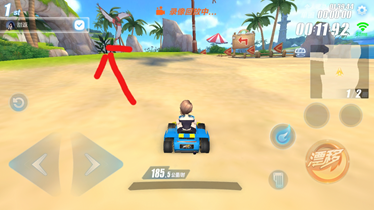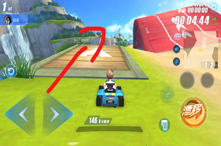 起点的位置有一座桥,这里一定不要过桥。因为刚开始的时候你没有氮气,速度根本提不上去,而且接下来还要上坡,速度肯定会更慢,这样很容易被队友甩得远远的,输都输在起跑线上了,后面完全没心情继续跑。那应该从哪里过去呢?看下面的图。