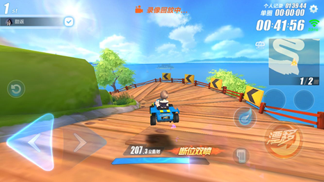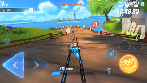 驶过两座大桥后便进入连续弯道区域,此时需要在即将贴近木桥的瞬间进行漂移操作。这样做不仅能有效避免车辆撞到赛道边缘,还能比常规漂移收集到更多的氮气,从而帮助我们拉开与其他玩家之间的距离。
