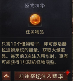 9、怪物精华就可以激活先祖之路,获得大量道具,每天注入3次,还有机会获得1张随机的怪物图鉴。