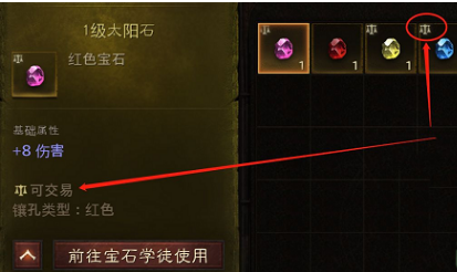5、宝石是否可交易可在背包中查看,值钱的宝石可拿去拍卖,需注意的是,交易宝石一旦被使用,便无法再进行交易。