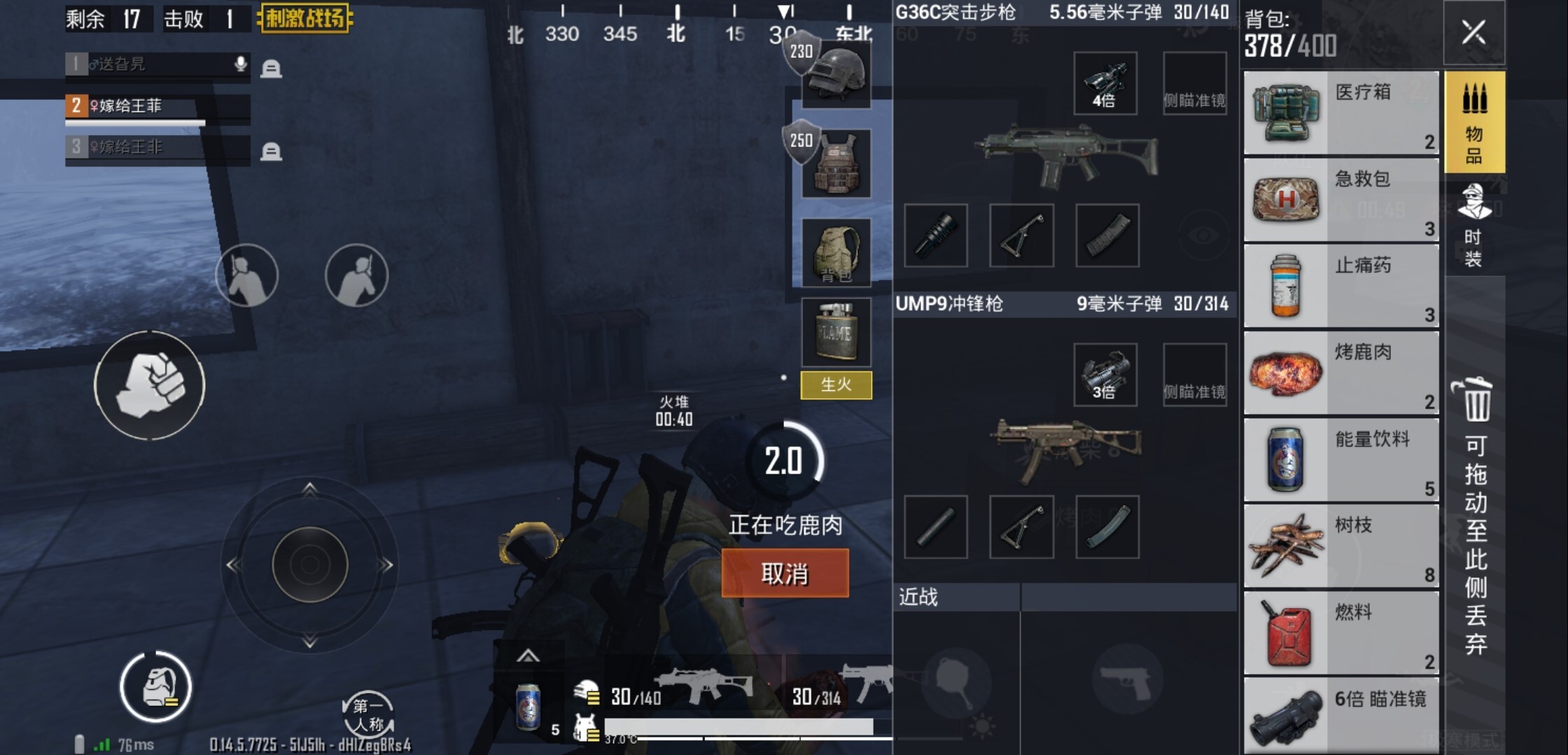 6、玩家进入游戏决赛圈后,圈里的毒会变得格外猛烈,稍作停留血量就会飞速下降。此时玩家就得使用急救包,或者效果更好的医疗箱来恢复状态。