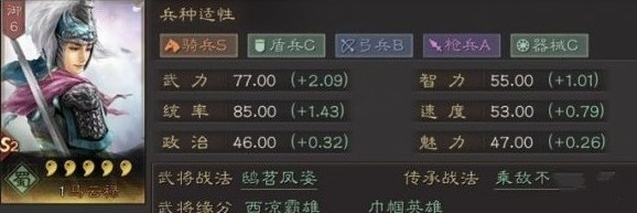 在游戏设定中,女性角色的攻击力普遍偏弱,马云禄作为女性角色,基础属性不算突出。她的战斗力刚到2.0,智商数值较高,但满级时比关羽低了二十多点。指挥能力方面,马云禄和马超相近,若升满数值还能略胜一筹。值得注意的是她的敏捷属性,由于天赋限制,只能适配S级坐骑,武器则建议避开A型。此外,马云禄属于发育节奏较慢的骑士类型,从数据层面分析,要让她发挥作用,需搭配能打持续战的武将与战法。