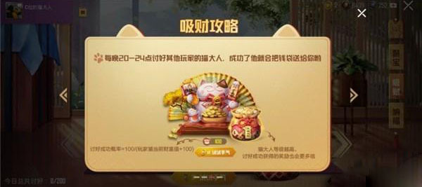 吸财是需要技巧的。玩家可以用猫元宝去讨好别人家的猫大人,要是讨好成功了,就能得到对方服饰币的钱袋;要是讨好失败了,玩家投入的元宝就会损失掉。玩家要留意,每天最多只能讨好两百次。
