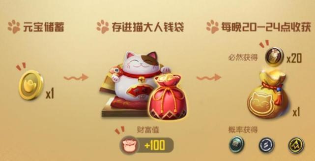 猫大人有三项功能,分别是聚宝、吸财和纳福。其中聚宝的玩法很简单,玩家每天存十个元宝,在晚上八点到十二点之间打开库存的钱袋就行。元宝存得越多,玩家能拿到的服饰币就越多,奖励也会更丰厚。猫元宝的获取途径有不少,一是每日任务,二是金运来福里的彩蛋。
