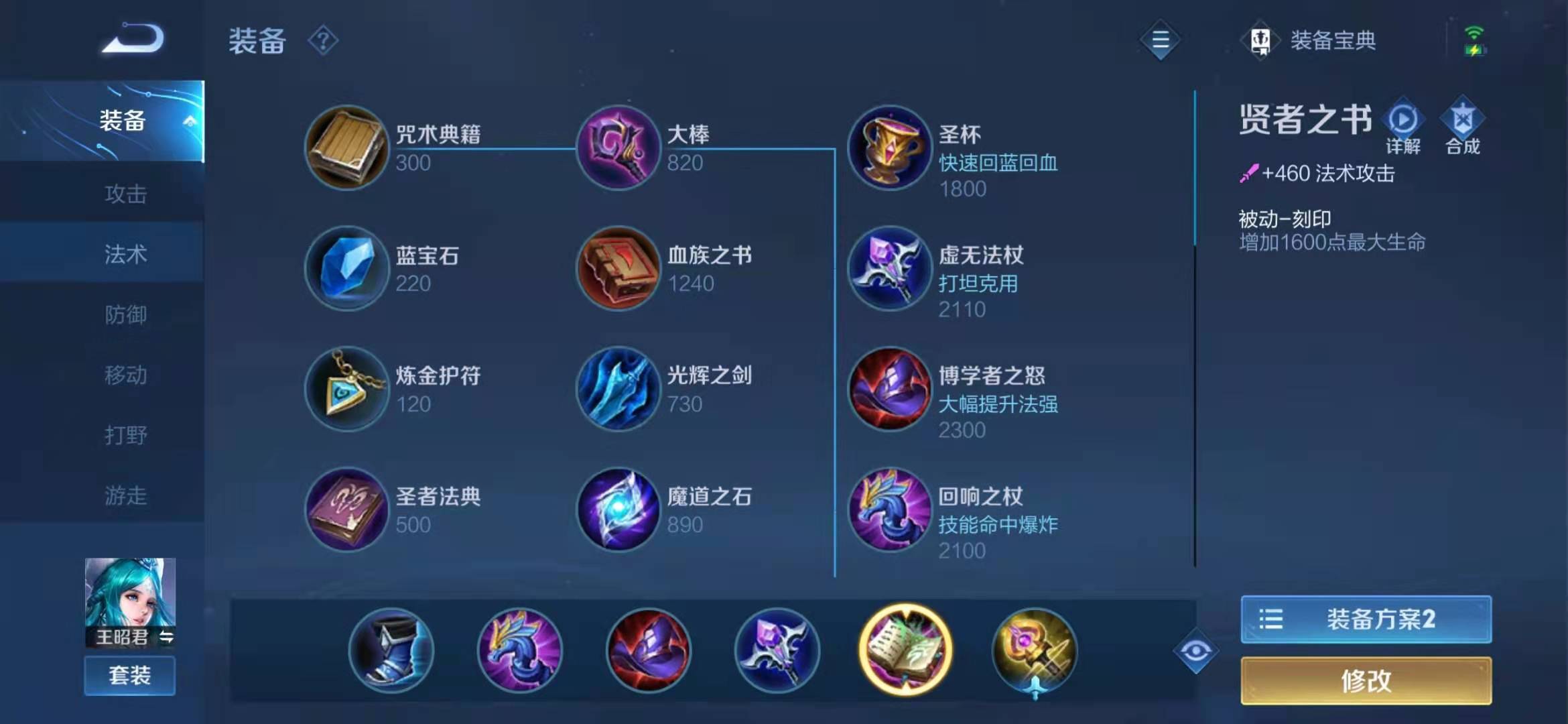 之后第五件装备选择贤者之书,它能为英雄增加一千六百点生命值,显著增强生存能力,更关键的是能提供四百六十点法术强度,这个数值几乎是法帽的两倍;最后一件装备则可以出辉月,借助它的主动效果能让英雄短暂进入无敌状态,以此来规避敌人的伤害。