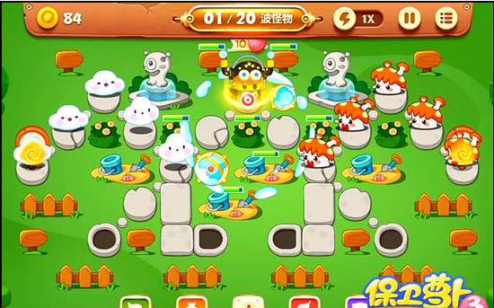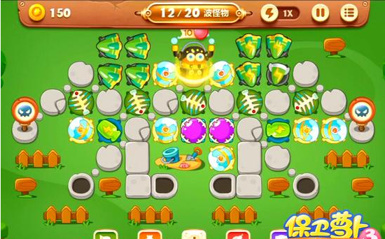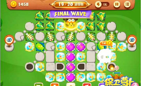 4、接下来要做的就是持续升级并加大炮塔的布局力度,下方区域主要布置雪球炮塔,中间一排则放置魔法球炮塔。在布局过程中及时暂停来升级炮塔,这样拿到金萝卜还是比较稳妥的。