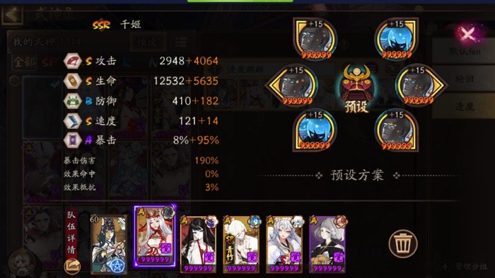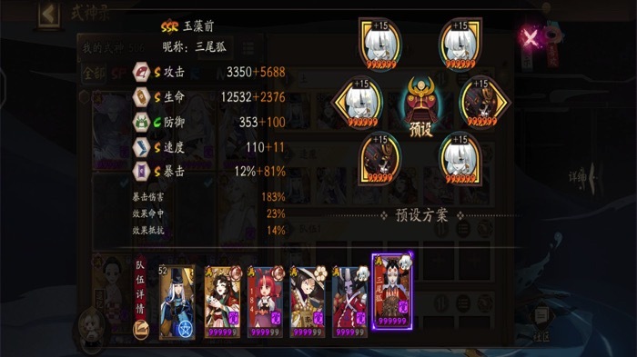 9、玉藻前:藻前的面板是真正意义上的纯ssr面板,4S1C的属性,并且12%暴击在式神中处于上游。