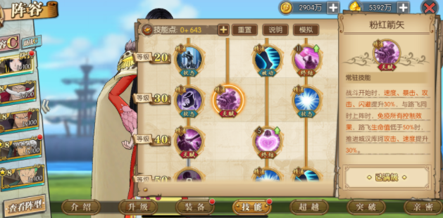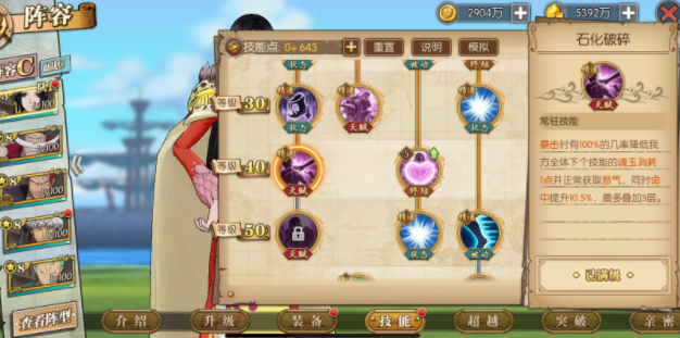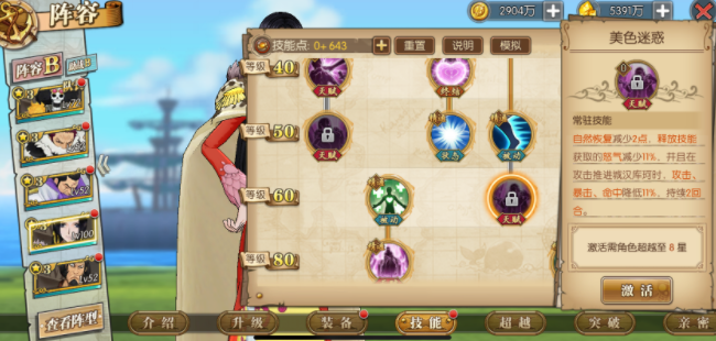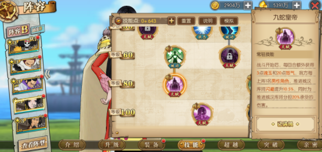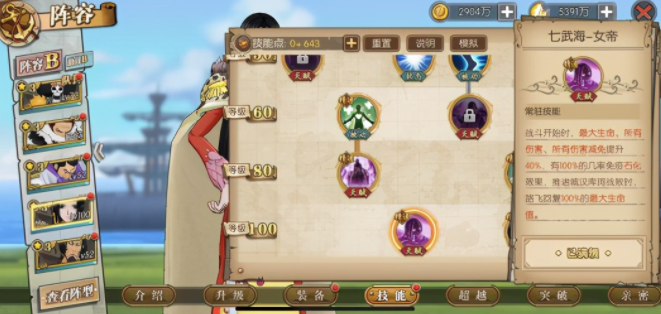 女帝的核心团队辅助天赋兼具自我保护功能,能在开场时为自身增加3魂玉和20点怒气,作为8魂玉的角色,这一效果尤为关键。接着看她的自我保护能力:战场上每出场1名男性角色,就能为她提升10.5%的闪避率。而队伍中若以路飞、青雉、藤虎这类男性角色为主导,女帝的闪避率可直接提升31.5%。此外,该天赋还能帮助女帝分担部分伤害,整体分担比例达到60%。不过面对单体输出较强的豹子这类对手时,女帝的生存状况依然主要依靠自身的闪避率来保障。