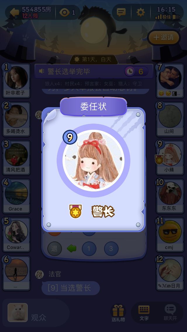 通过投票的方式选出警长。规则如下:只有没有参与警长竞选的玩家具备投票资格,他们也可以选择放弃投票。要是得票数最高的竞选者不止一位,那么这些竞选者需要进行PK发言,之后再次组织投票。倘若经过再次投票后依旧出现平票的情况,那么这一局游戏就不会产生警长。