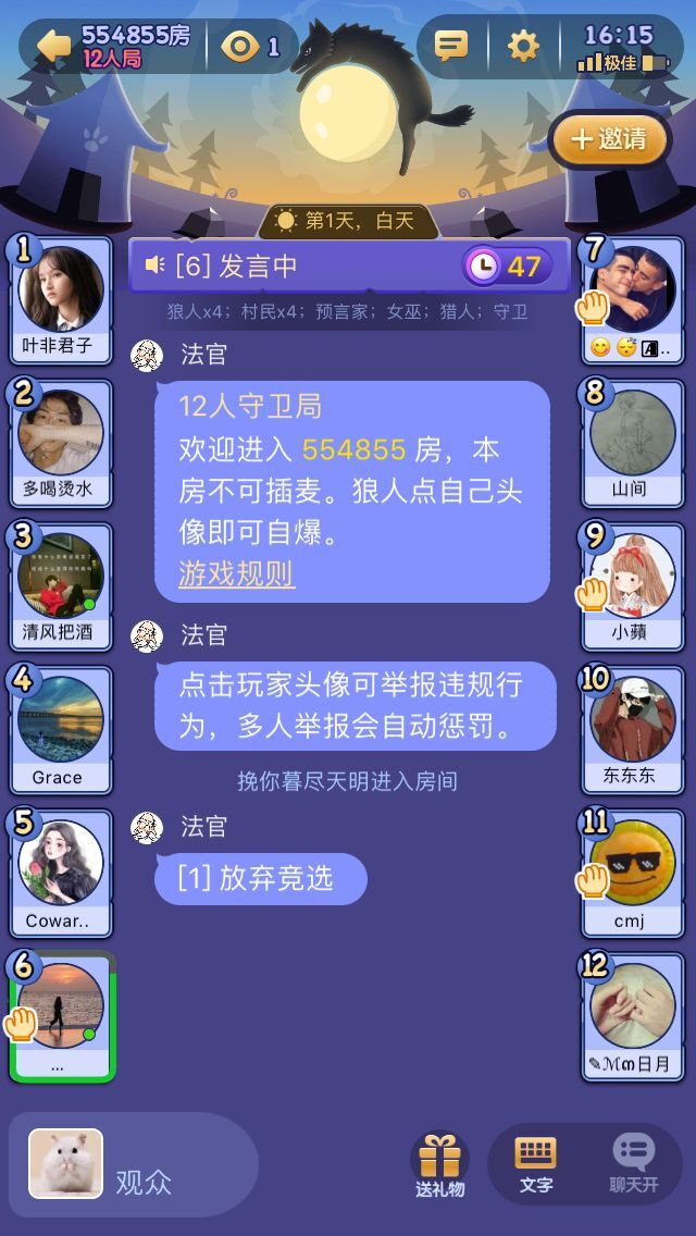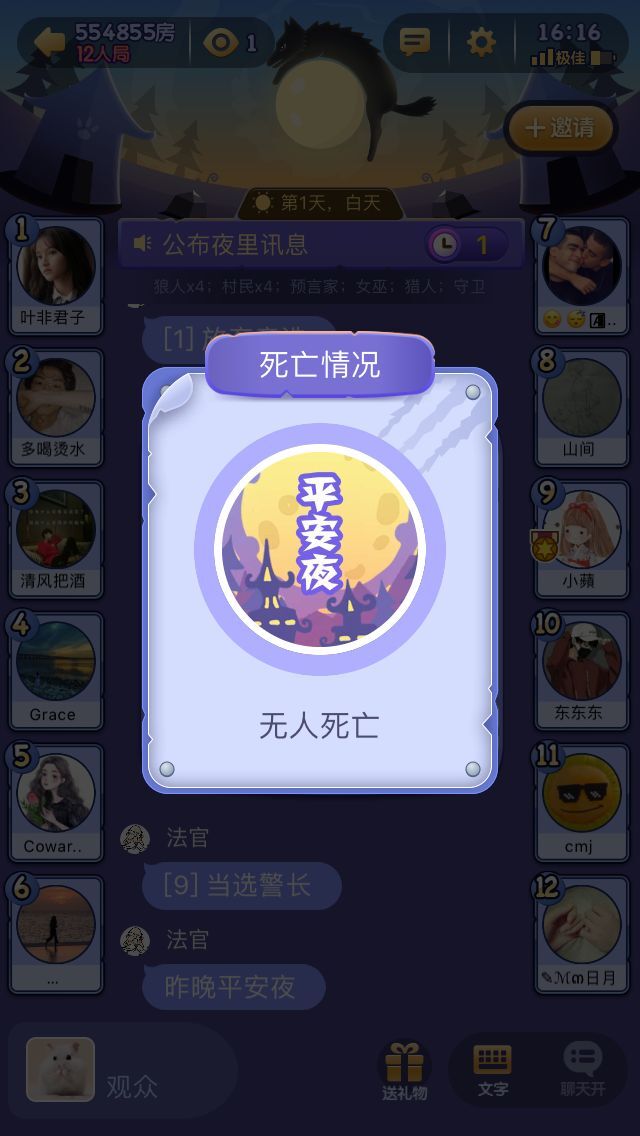 游戏配置:三个狼人、一个战狼、三个村民、一个混血儿、一个预言家、一个女巫、一个猎人、一个名媛。