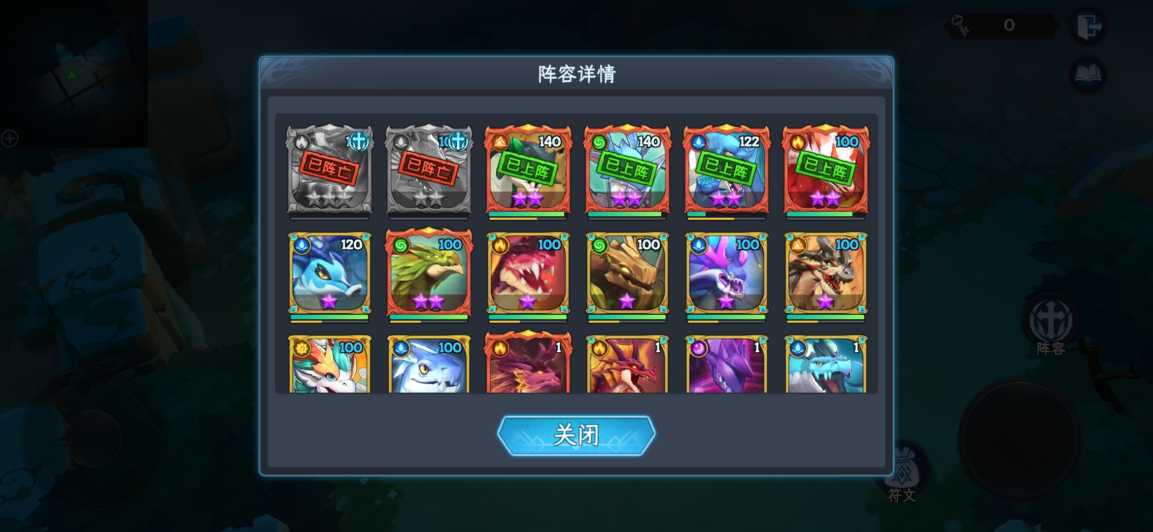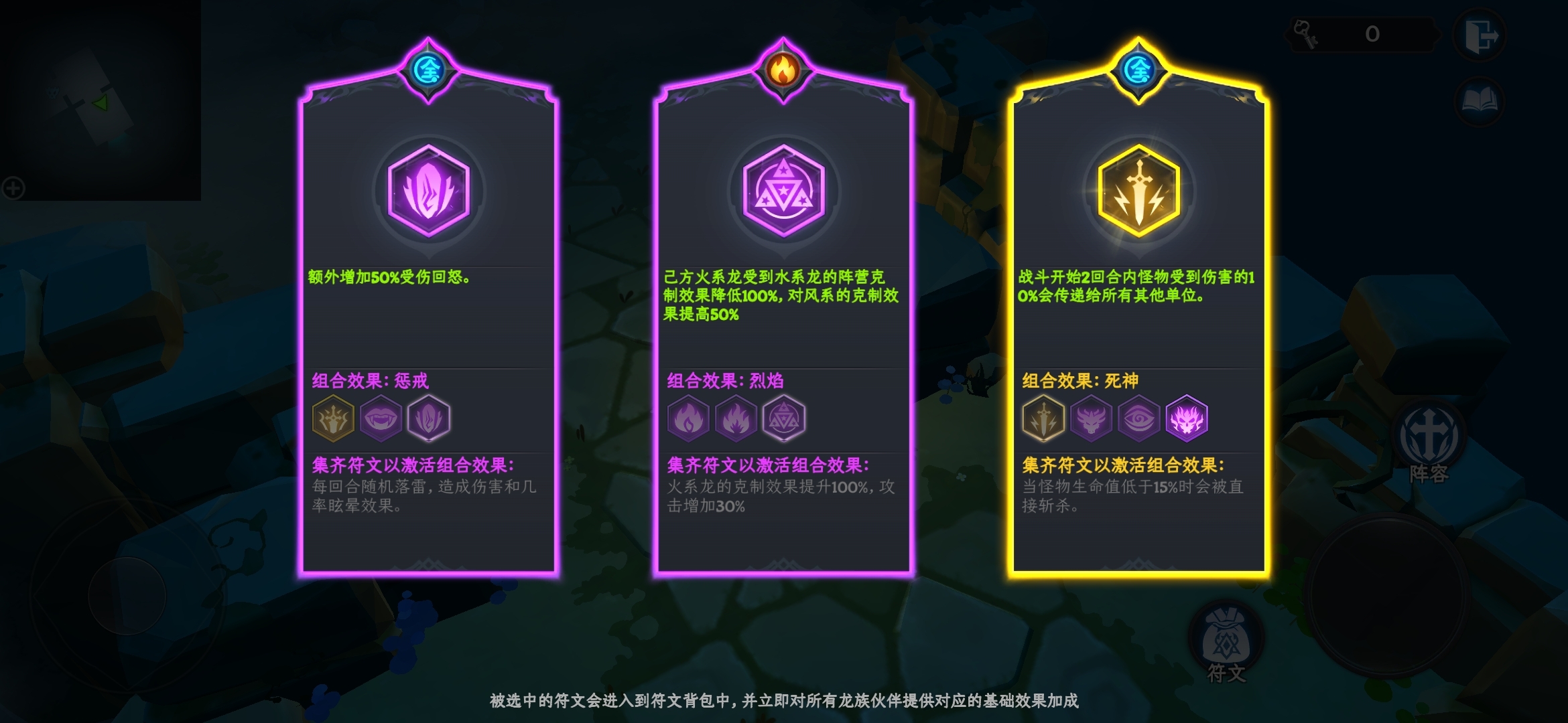 不过值得一提的是,击败守护龙后会随机掉落符文,这些符文有蓝色、紫色和金色三种品质,可分为攻击与辅助两大类别。其中,不同的紫色和金色符文之间能够形成多样的组合效果,一旦激活这些组合效果,就能为阵容带来更为丰厚的加成。