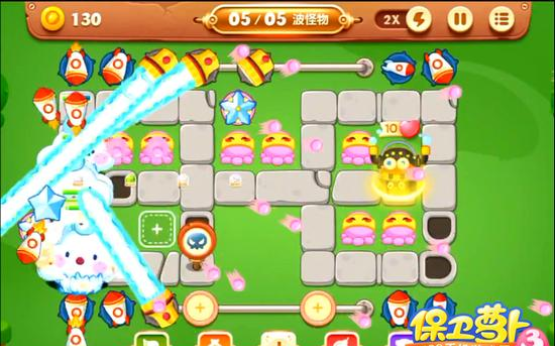 3、把下方的火箭也部署出来,布局以中间的章鱼为核心,最终的布局参考如下。要是金钱不足,火箭不一定非要升满级,可根据实际情况灵活选择;冰冻星则建议适当放置几个来起到减速效果。