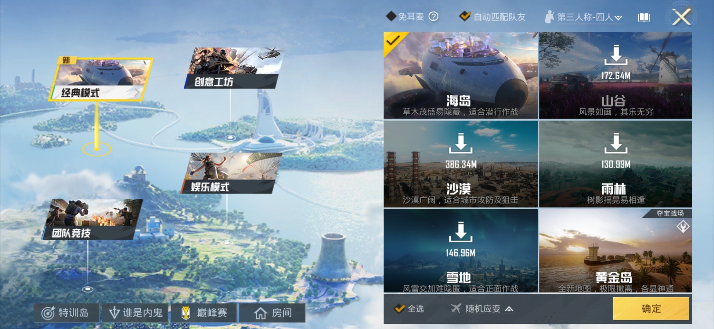 玩家若想进入黄金岛地图,需先打开和平精英的首页,接着点击左上角的游戏模式选项,在六个地图中找到位于右下角的黄金岛地图,完成下载并打开后,就能成功进入黄金岛了。