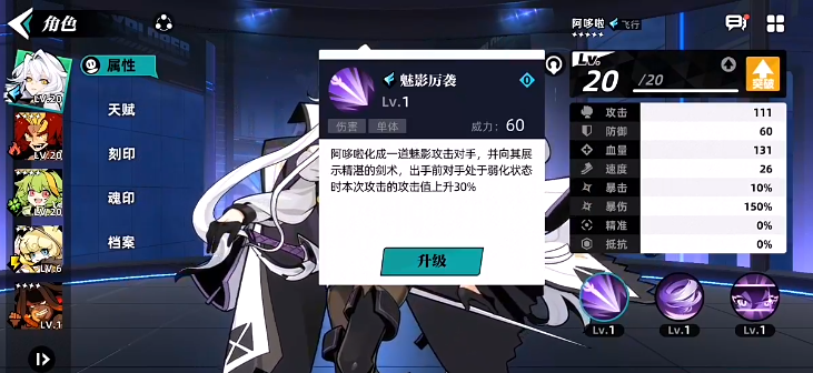 作为中庭的管理者,她不仅具备极强的输出能力,还有着自己坚守的原则,剑术更是精妙绝伦,是游戏里为数不多的强势输出角色,通常很难碰到能与之抗衡的对手,在一对一的情况下几乎无人能敌。这个角色带有飞行印记,她的每一招每一式都十分华丽炫酷,总共拥有三个技能,其中一技能名为“魅影厉袭”,是单体攻击类型的技能,能够对敌方指定目标展现出凌厉的剑术;要是在发动攻击时,目标正好处于弱化状态,那么这次攻击的伤害值还会提升30%。