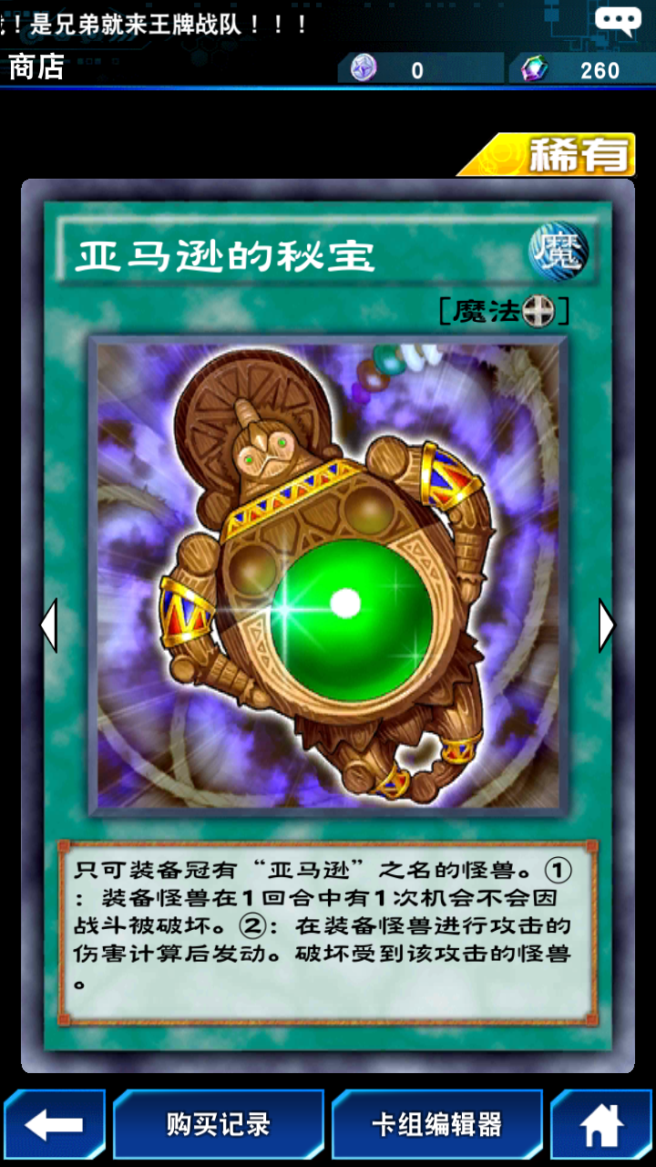 亚马逊秘宝是当前版本亚马逊卡组不可或缺的核心卡牌,它能让持有者避免战斗破坏,同时还能与亚马逊的反伤机制形成联动。
