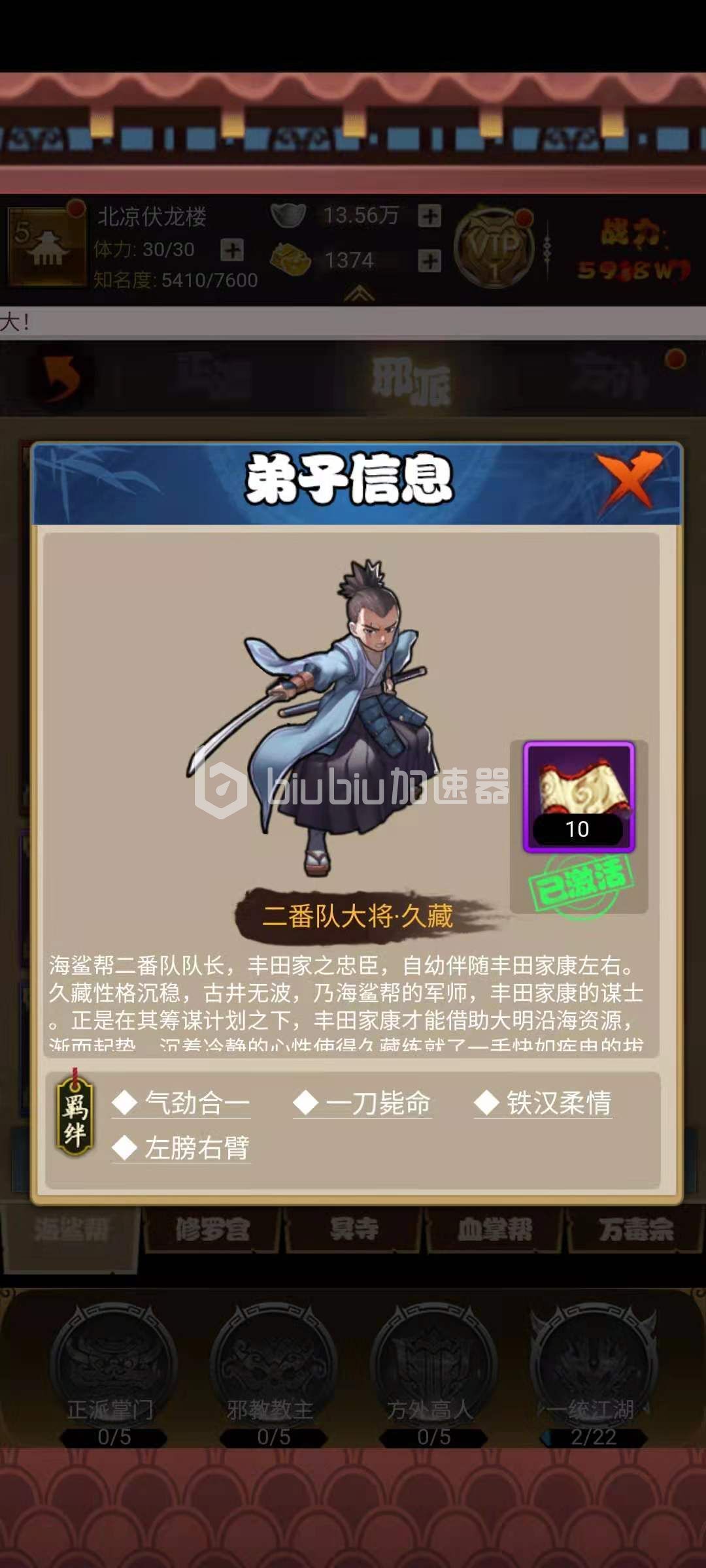 输出文本:伤害高的技能仅有居合斩,因此我们可选择让皮糙肉厚的弟子与血鲨帮的对手对位,优先考虑铸剑山庄、丐帮或者冥寺等弟子。战斗获胜后会奖励一把洛阳铲,交给冥寺弟子使用恰好能激活羁绊。