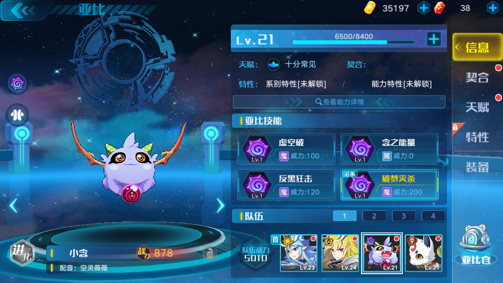 在游戏里若想让小念这只亚比完成进化,玩家得去做“陪伴”这个支线任务。经历一段简短的剧情介绍后,战斗任务就会被触发。念的进化任务包含两个关卡,分别是“心结”与“心魔”,把这两个关卡都完成,就能解锁念的进化形态了。